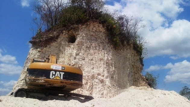 Las fotos muestran cómo las retroexcavadoras retiran la base de la pirámide, dejando solo lo que parecía ser la clásica cámara maya colgada sobre una sección excavada.