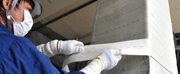 El proceso SRF (Super Reinforcement with Flexibility) es realmente tan simple como suena. Sólo hay que exponer la superficie de un pilar, aplicar un diseño especial de adhesivo libre de disolventes y envolver las tiras de tela con fuerza alrededor de la columna, para que su resistencia se haga más alta.